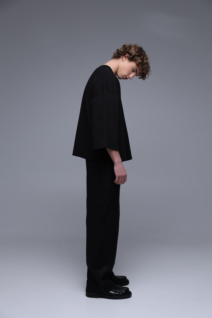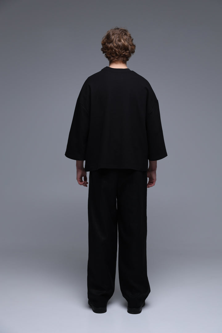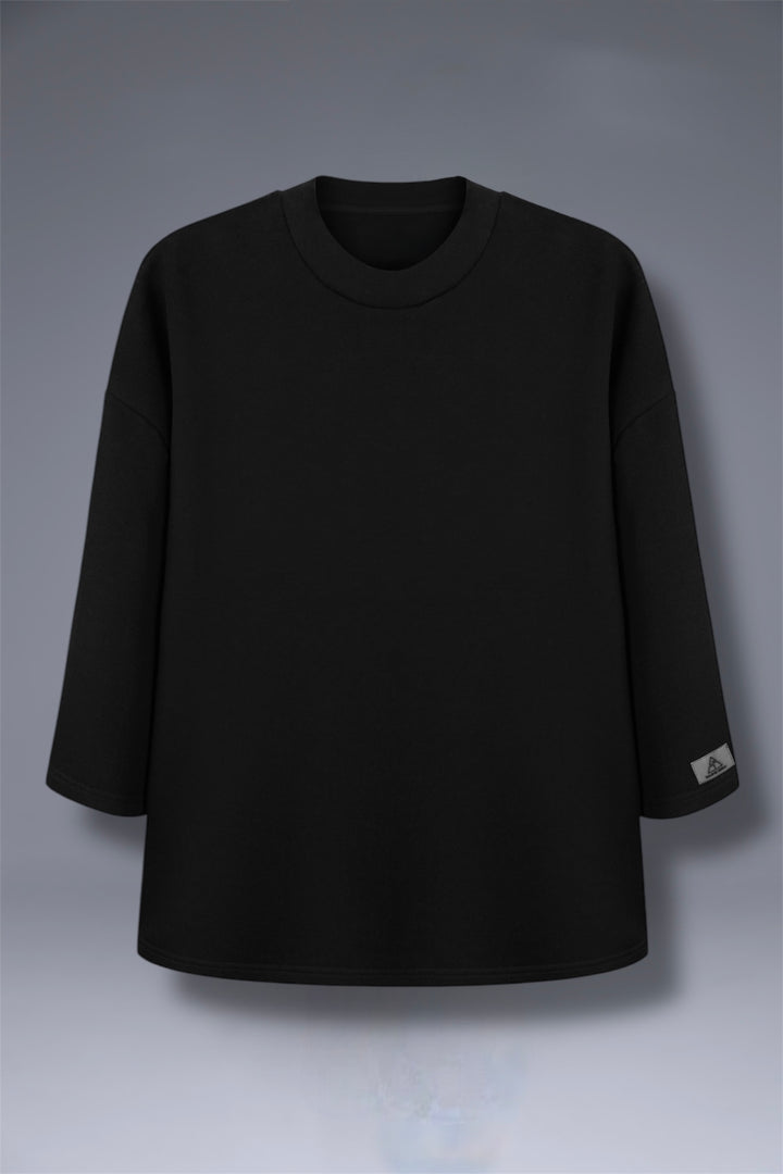 This black oversized cropped t-shirt redefines relaxed elegance with its streamlined silhouette and premium fabric. Featuring 3/4 sleeves for a modern touch, it combines comfort and style effortlessly. The cropped design...
