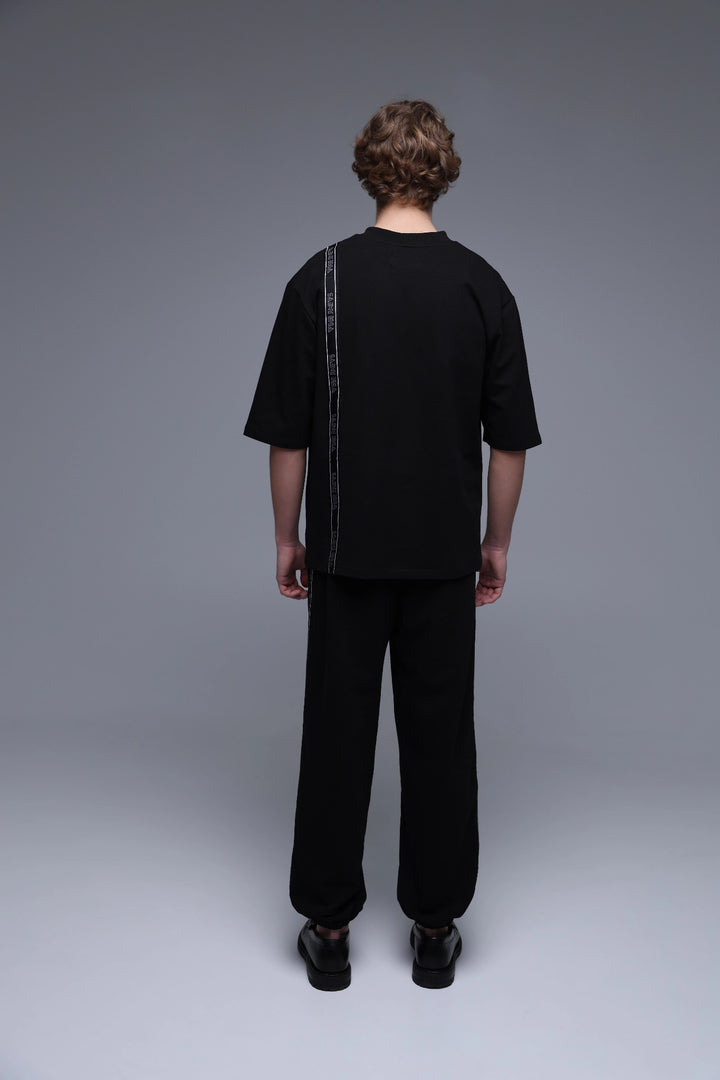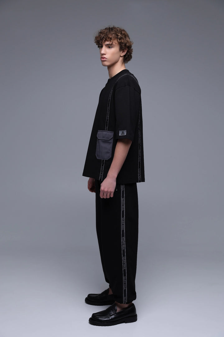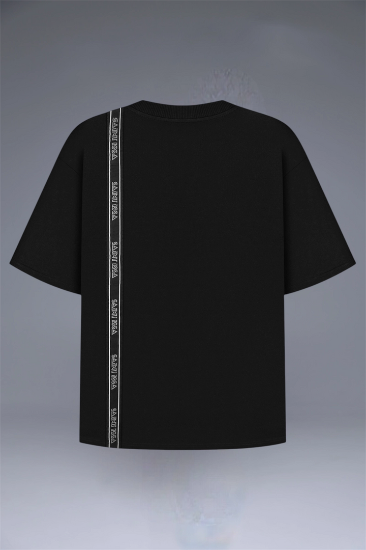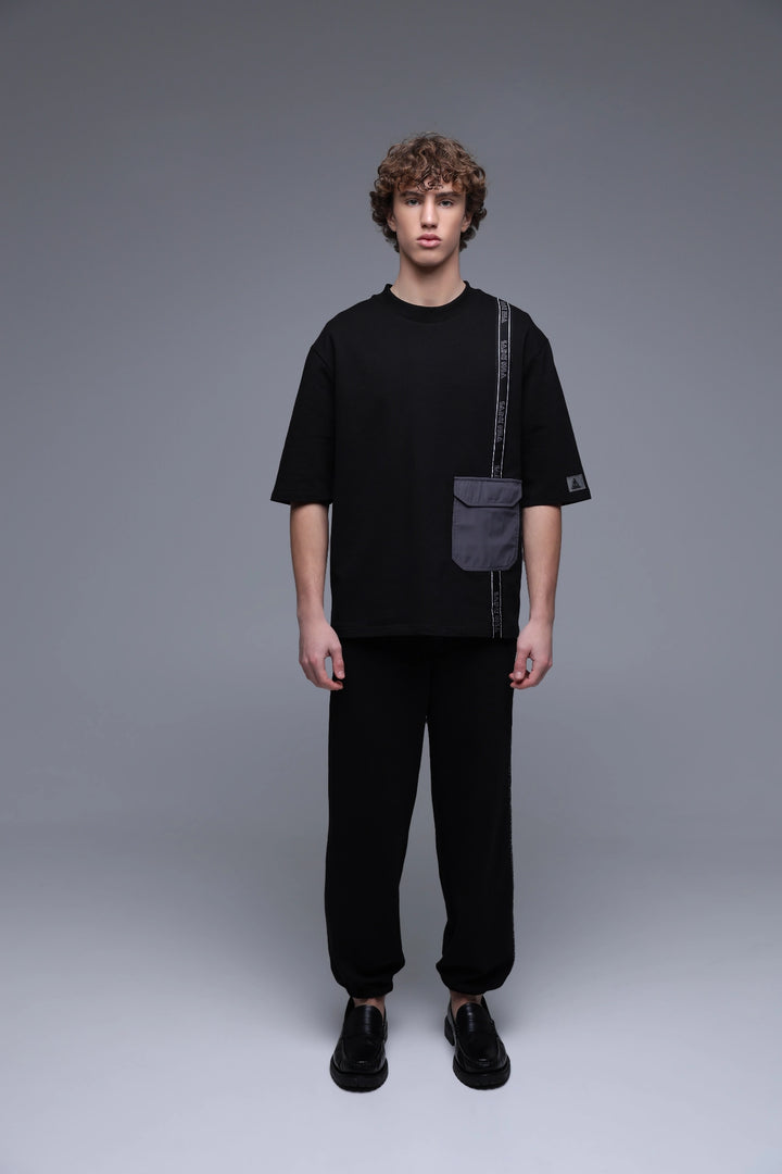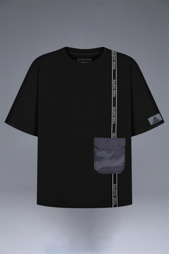 Discover contemporary fashion with our black oversized T-shirt, crafted from 250 gsm premium fabric (95% cotton, 5% elastane). The grey pocket features a hidden magnet for a sleek, button-free look, while a vertical stripe adds a dynamic edge. Adorned with the Saint Issa logo in a refined rubber patch on the sleeve, this piece is part of our capsule collection, seamlessly pairing with matching pants or sweatshirts. Experience comfort and high-fashion sensibility with Saint Issa.