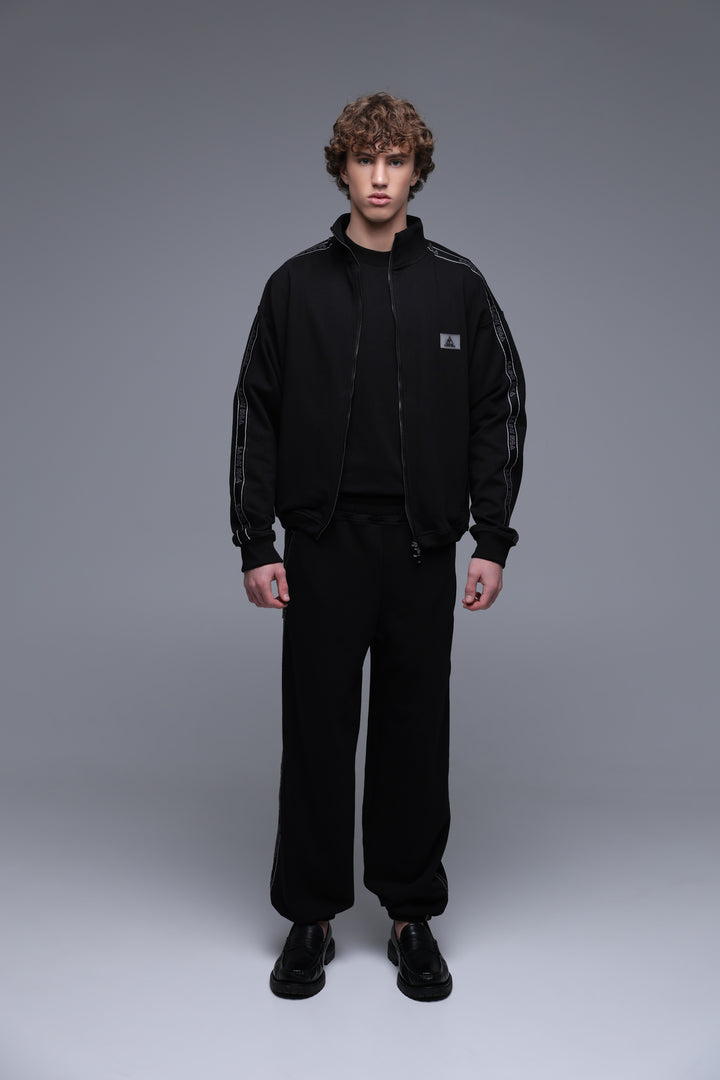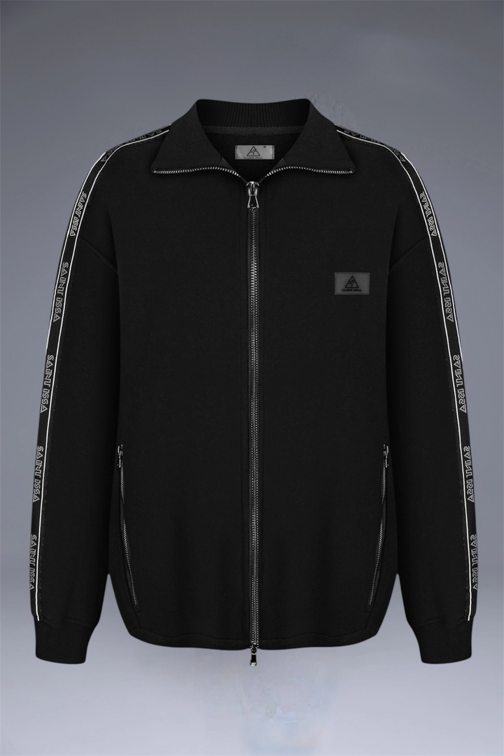 Embrace modern sophistication with our black crop high-collar jacket, crafted from 360 gsm premium quality fabric (95% cotton, 5% elastane). The jacket features the brand name "SAINT" elegantly repeated along the sleeves and is equipped with durable YKK zippers for a sleek finish. A small triangular patch with the Saint Issa logo adorns the left chest, adding a subtle touch of elegance. Metal adjusters on the sides of the cuffs allow for customizable volume, enhancing both function and style. Designed for contemporary layering, this cropped jacket seamlessly integrates with matching pieces from our capsule collection. Experience the perfect blend of fashion and utility with Saint Issa.