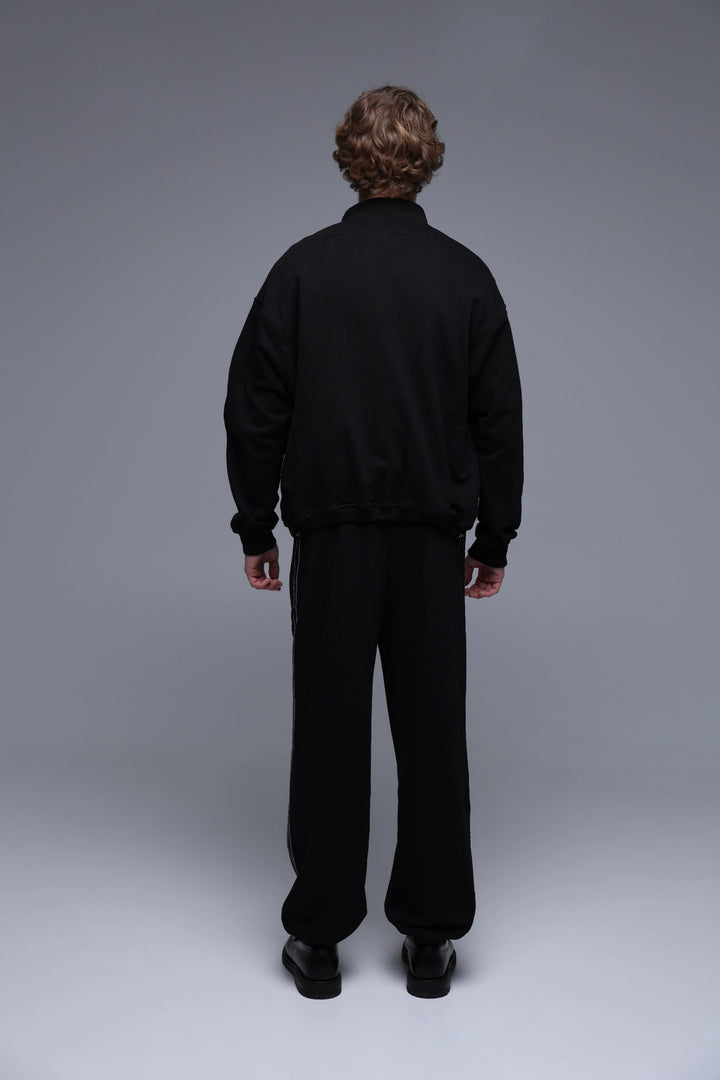 Embrace modern sophistication with our black crop high-collar jacket, crafted from 360 gsm premium quality fabric (95% cotton, 5% elastane). The jacket features the brand name "SAINT" elegantly repeated along the...